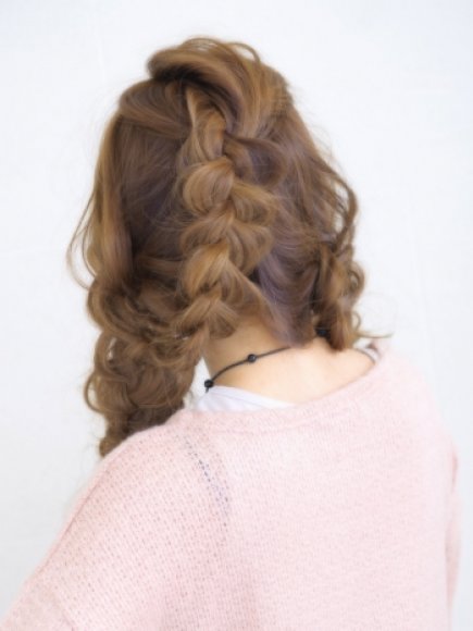 中間?毛先をコテで巻きます。前髪以外をトップ、左右サイドに分けて三つ編みにします。編み目をほぐして、トップの毛先をサイドの編みこみに入れ込んで完成です。